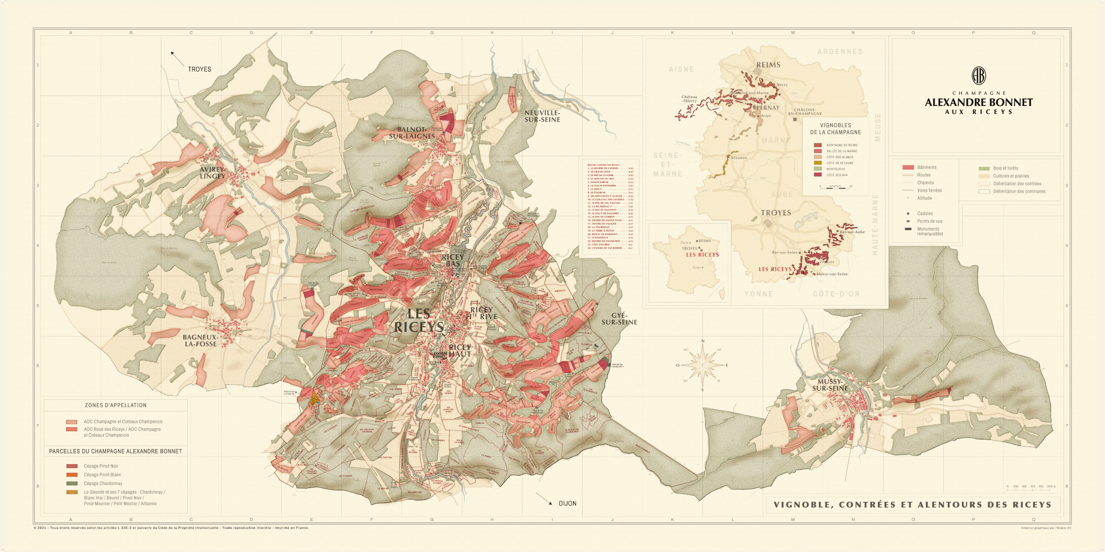 Bestaan er ook nog de lieux-dits – die eigenlijk alleen in de Champagne zo heten maar hey, de wijnschuren in Les Riceys hebben twee deuren; één naar de Champagne, één naar de Bourgogne waar ze eerder climats zijn… (een climat kan meerdere lieux-dits beslaan maar ook maar één) – historie ja; in vroeger eeuwen keek men eerst wat de kwaliteit c.q. stijl van de jaarproductie was, en daarna pas welke deur die naar buiten ging – en je hoort de naam ook nog weleens verkeerd gebruikt in die buurstreek waar het dus andersom moet zijn. Tienduizenden lieux-dits, uit een totaal aantal plotjes dat zo rond de 280.000 ligt voor een wijnmaker of 16.000 (waaronder weer coöperaties), dus. Dus als u nog eens Les Soupe-Tard (late diners, ja de spelling klopt), Les Gouttes d’Or (gouddruppeltjes, zie onderin de vele daarvan! op diverse oude kaartjes), Les Côtes à Bras (armzijden), Les Chauffours (kachels…, ook meerdere), Les Froids Monts (koude pieken) of iets dergelijks tegenkomt, dan weet u hoe laat het is.